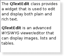 The QTextEdit 类提供用于编辑和显示纯文本和富文本两者的 Widget。 |