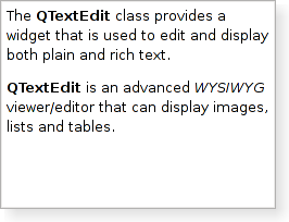 The QTextEdit 类提供用于编辑和显示纯文本和富文本两者的 Widget。 |