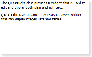 The QTextEdit 类提供用于编辑和显示纯文本和富文本两者的 Widget。 |