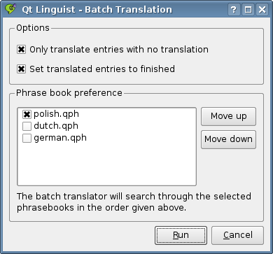 Use the batch translation feature of Qt Linguist to automatically translate source texts that are also in a phrase book. Selecting Edit|Batch Translation will show you the batch translation dialog, which let you configure which phrase books to use in what order during the batch translation process. Furthermore you can set whether only entries with no present translation should be considered, and whether batch translated entries should be set to finished (see also String Translation States ).