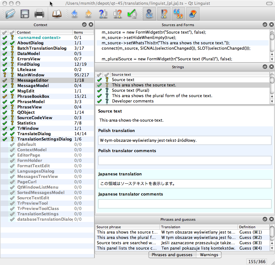 Qt Linguist can now load and edit multiple translation files simultaneously. One use for this is the case where you know two languages better than you know English (Polish and Japanese, say), and you are given an application's Polish translation file and asked to update the application's Japanese translation file. You are more comfortable translating Polish to Japanese than you are translating English to Japanese.