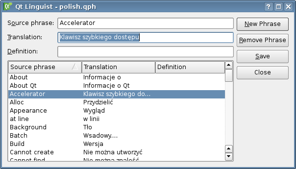 A Qt Linguist phrase book is a set of source phrases, target (translated) phrases, and optional definitions. Typically one phrase book will be created per language and family of applications. Phrase books are used to provide a common set of translations to help ensure consistency. They can also be used to avoid duplication of effort since the translations for a family of applications can be produced once in the phrase book. If the translator reaches an non-translated phrase that is the same as a source phrase in a phrase book, Qt Linguist will show the phrase book entry in the Phrases and Guesses Window .