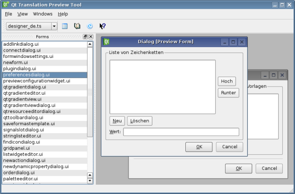 Forms created by Qt Designer are stored in special UI files. Qt Linguist can make use of these UI files to show the translations done so far on the form itself. This of course requires access to the UI files during the translation process. Activate Tools|Open/Refresh Form Preview to open the window shown above. The list of UI files Qt Linguist has detected are displayed in the Forms List on the left hand. If the path to the files has changed, you can load the files manually via File|Open Form... . Double-click on an entry in the Forms List to display the Form File. Select <No Translation> from the toolbar to display the non-translated form.