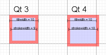Prior to Qt 4, QPainter specialized the pen drawing for rectangle based functions (in particular: drawRect , drawEllipse , drawRoundRect , drawArc , drawChord and drawPie ). When stroking a rectangle of width 10, the pen would draw a rectangle of width 10. Drawing a polygon defined by the corner points of the same rectangle the stroke would have a width of 11.