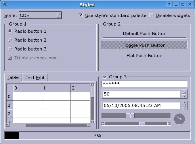 This style provides a slightly improved Motif look similar to some versions of the Common Desktop Environment (CDE). The main differences are thinner frames and more modern radio buttons and checkboxes. Together with a dark background and a bright text/foreground color, the style looks quite attractive (at least for Motif fans).