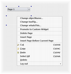 You must reimplement several functions to enable Qt Designer to manage a custom multi-page container widget: Qt Designer 使用 count () to keep track of the number pages in your container, widget () to return the page at a given index in the list of the container's pages, and currentIndex () to return the list index of the selected page. Qt Designer 使用 addWidget () function to add a given page to the container, expecting it to be appended to the list of pages, while it expects the insertWidget () function to add a given page to the container by inserting it at a given index.