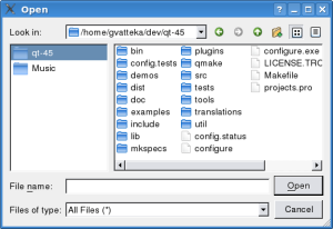 | QFileDialog (QWidget * parent = 0, const QString & caption = QString(), const QString & directory = QString(), const QString & filter = QString()) | |
