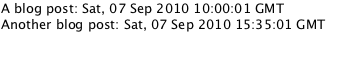 <?xml version="1.0" encoding="utf-8"?> <rss version="2.0"> ... <channel> <item> <title>A blog post</title> <pubDate>Sat, 07 Sep 2010 10:00:01 GMT</pubDate> </item> <item> <title>Another blog post</title> <pubDate>Sat, 07 Sep 2010 15:35:01 GMT</pubDate> </item> </channel> </rss>