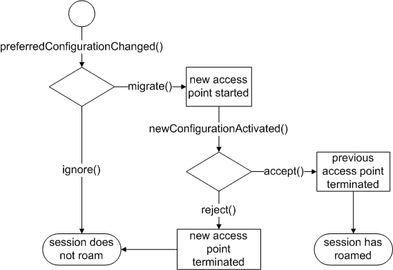 Applications may connect to the preferredConfigurationChanged () signal in order to receive notifications when a more suitable access point becomes available. In response to this signal the application must either initiate the roaming via migrate () 或 ignore () the new access point. Once the session has roamed the newConfigurationActivated () signal is emitted. The application may now test the carrier and must either accept () 或 reject () it. The session will return to the previous access point if the roaming was rejected. The subsequent state diagram depicts the required state transitions.