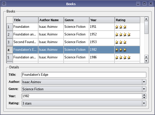 Information about a collection of books is held in a database. The books are catalogued by author, title, genre, and year of publication. Although each of these fields can be displayed and edited using standard widgets, an additional field describing an arbitrary rating for the book needs something extra.