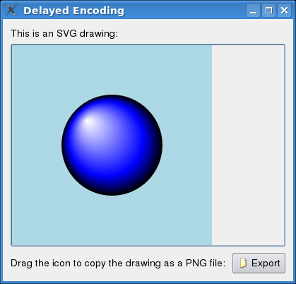 push button is pressed down to start the drag. The data for the drag and drop operation is not processed until the user of the application has found a valid drop target. This removes redundant processing if the operation is aborted. In our case, we have an SVG image that we wish to send as the