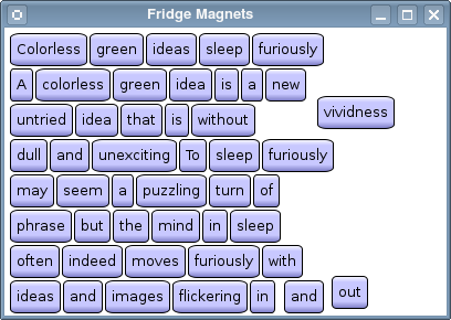 With this application the user can play around with a collection of fridge magnets, using drag and drop to form new sentences from the words on the magnets. The example consists of two classes: