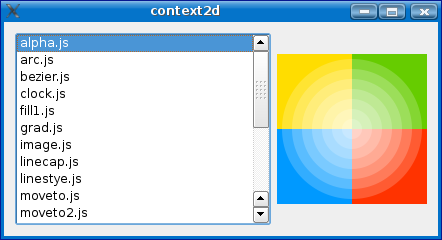 The QContext2DCanvas class provides a widget that renders the contents of a Context2D object. It also provides a minimal scripting API, most notably the getContext() function.