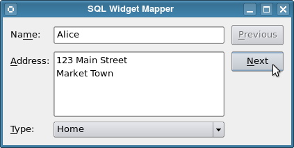 Window::Window(QWidget *parent) : QWidget(parent) { setupModel(); nameLabel = new QLabel(tr("Na&me:")); nameEdit = new QLineEdit(); addressLabel = new QLabel(tr("&Address:")); addressEdit = new QTextEdit(); typeLabel = new QLabel(tr("&Type:")); typeComboBox = new QComboBox(); nextButton = new QPushButton(tr("&Next")); previousButton = new QPushButton(tr("&Previous")); nameLabel->setBuddy(nameEdit); addressLabel->setBuddy(addressEdit); typeLabel->setBuddy(typeComboBox);