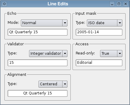class, containing a selection of line edits with different input constraints and display properties that can be changed by selecting items from comboboxes. Presenting these together helps developers choose suitable properties to use with line edits, and makes it easy to compare the effects of each validator on user input.