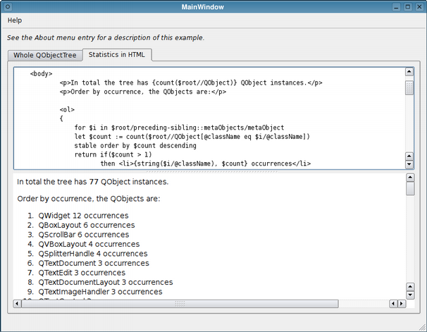 This example illustrates two important points about using XQuery to query non-XML data modeled to look like XML. The first point is that a custom node model class doesn't always have to actually build the node model. Sometimes the node model can be an already existing data structure, like the QObject tree used in this example. The second point is to explain what is required to make non-XML data look like XML.