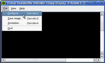 The File menu allows the user to configure the virtual framebuffer display ( File|Configure... ), save a snapshot of the framebuffer contents ( File|Save Image... ) and record the movements in the framebuffer ( File|Animation... ).